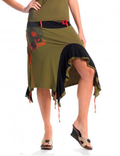 Un bel esprit ethnique pour cette jupe courte d'été noire 100% coton, imprimée aztèque sur le bas, et confortable avec sa fermeture au dos à zip et bouton. Elle est pincée devant et derrière pour un tombé impeccable. Sa frange noire très tendance lui ajoute un look moderne. Longueur S : 43,5cm - XXL : 50cm